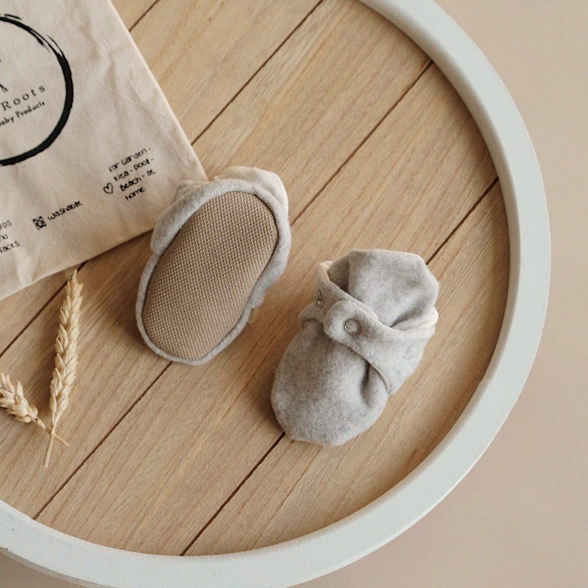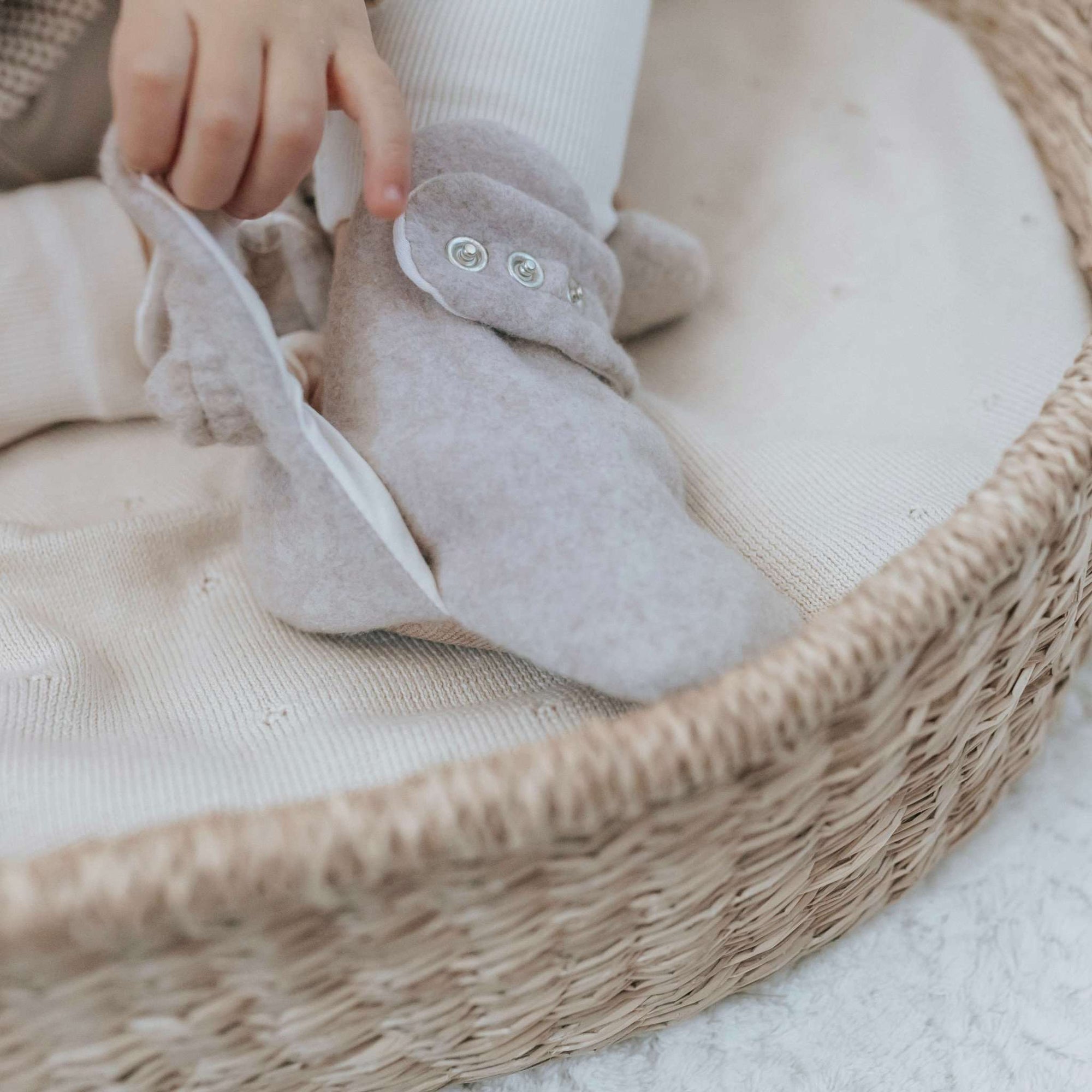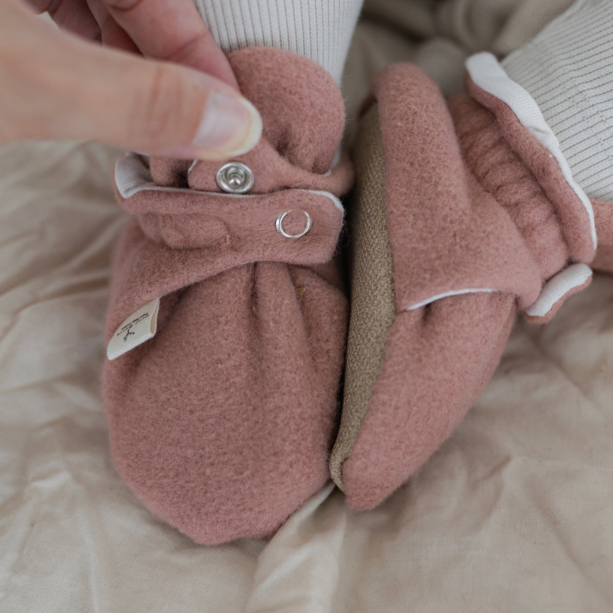 Kuschelig weiche Booties aus GOTS-zertifizierter Bio Baumwolle mit praktischem Druckknopf um die Weite des Schuhs individuell einzustellen.