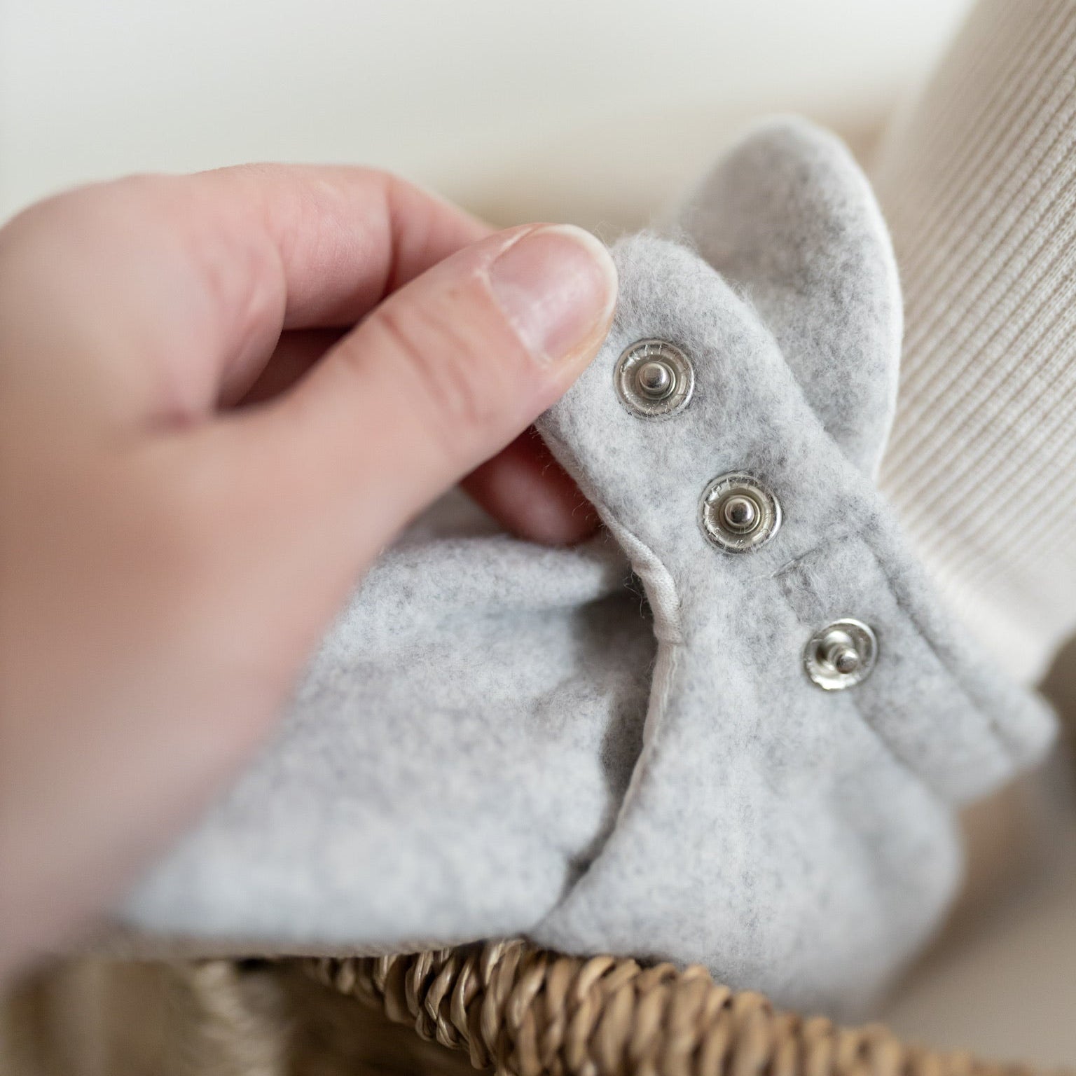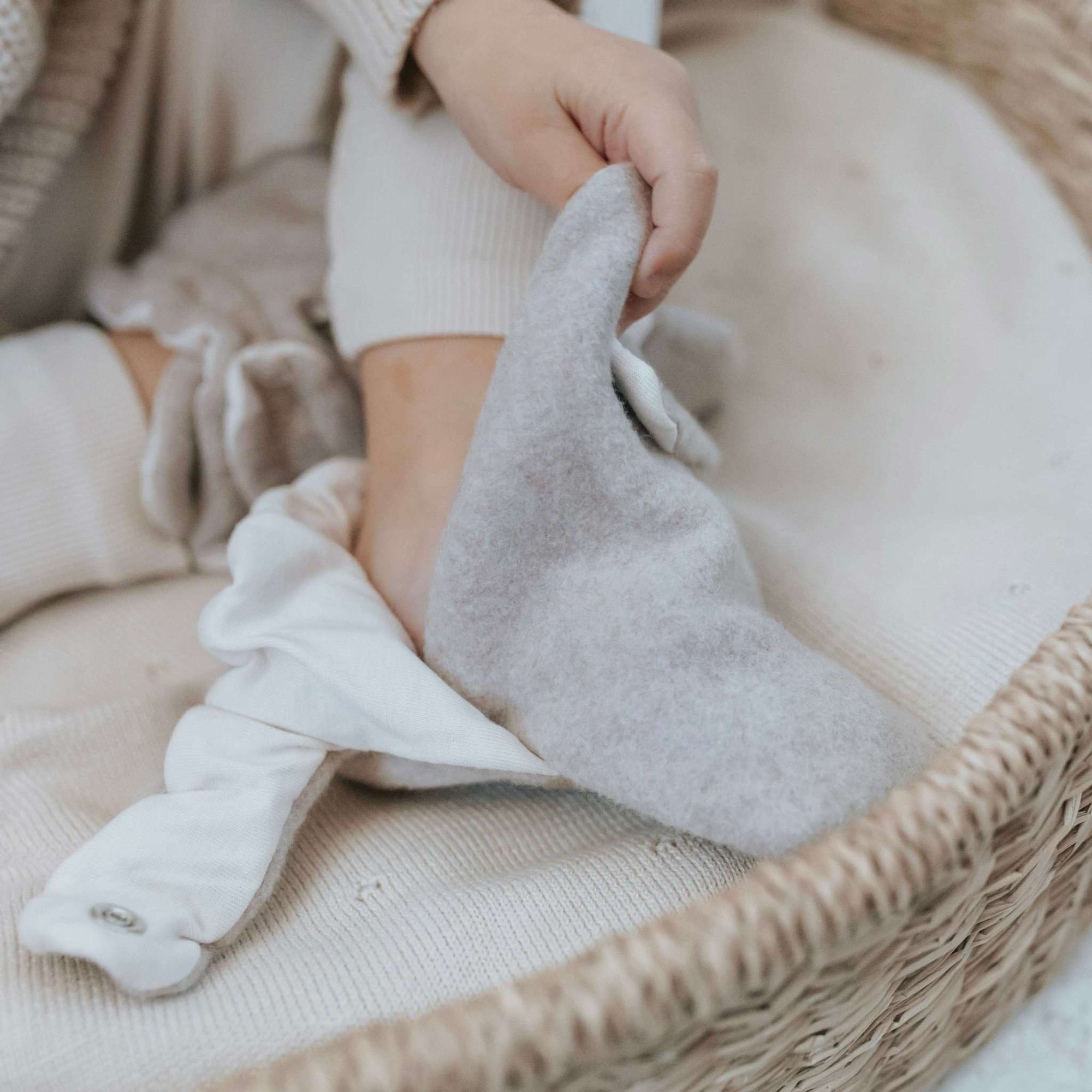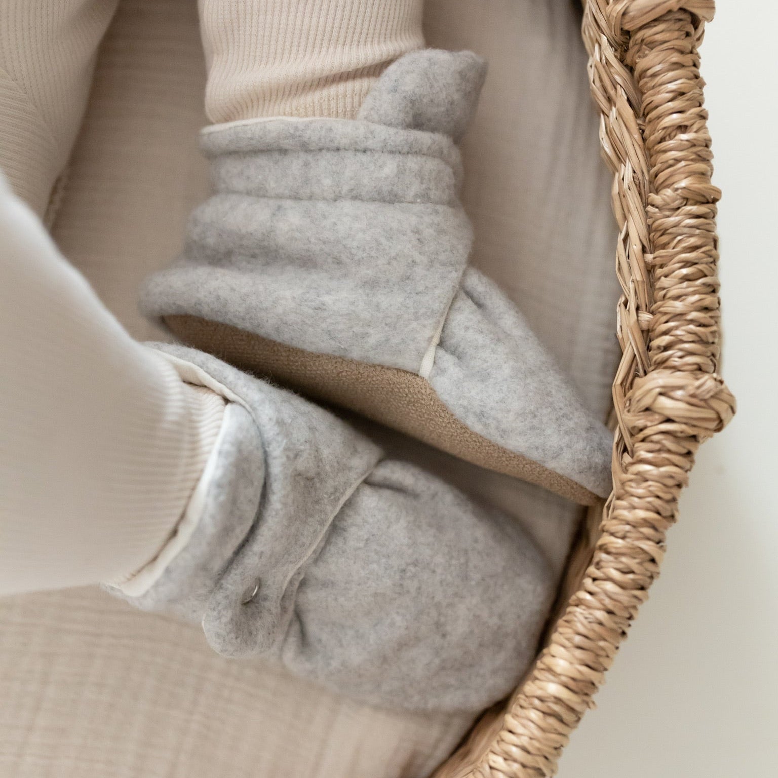 Kuschelig weiche Booties aus GOTS-zertifizierter Bio Baumwolle mit praktischem Druckknopf um die Weite des Schuhs individuell einzustellen.