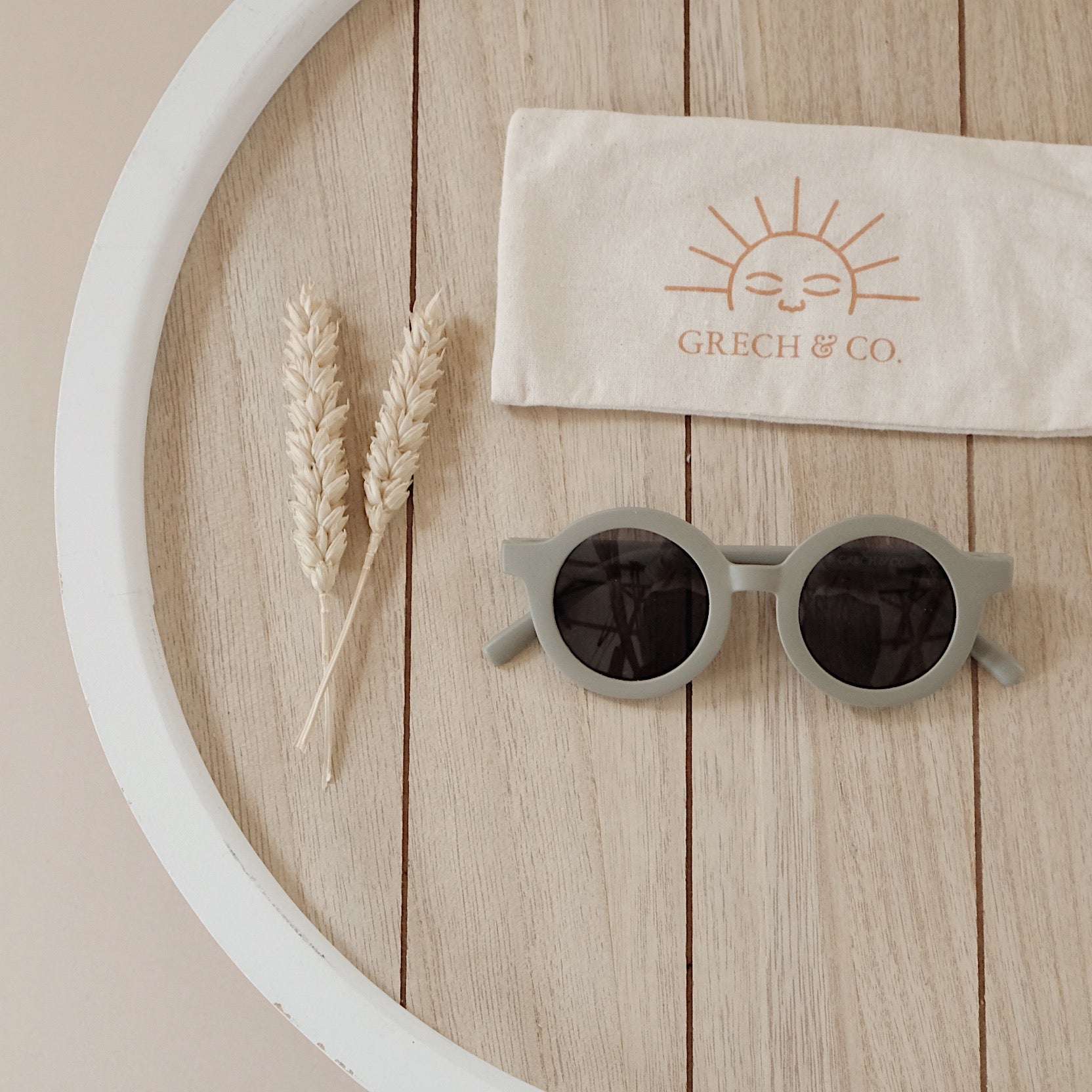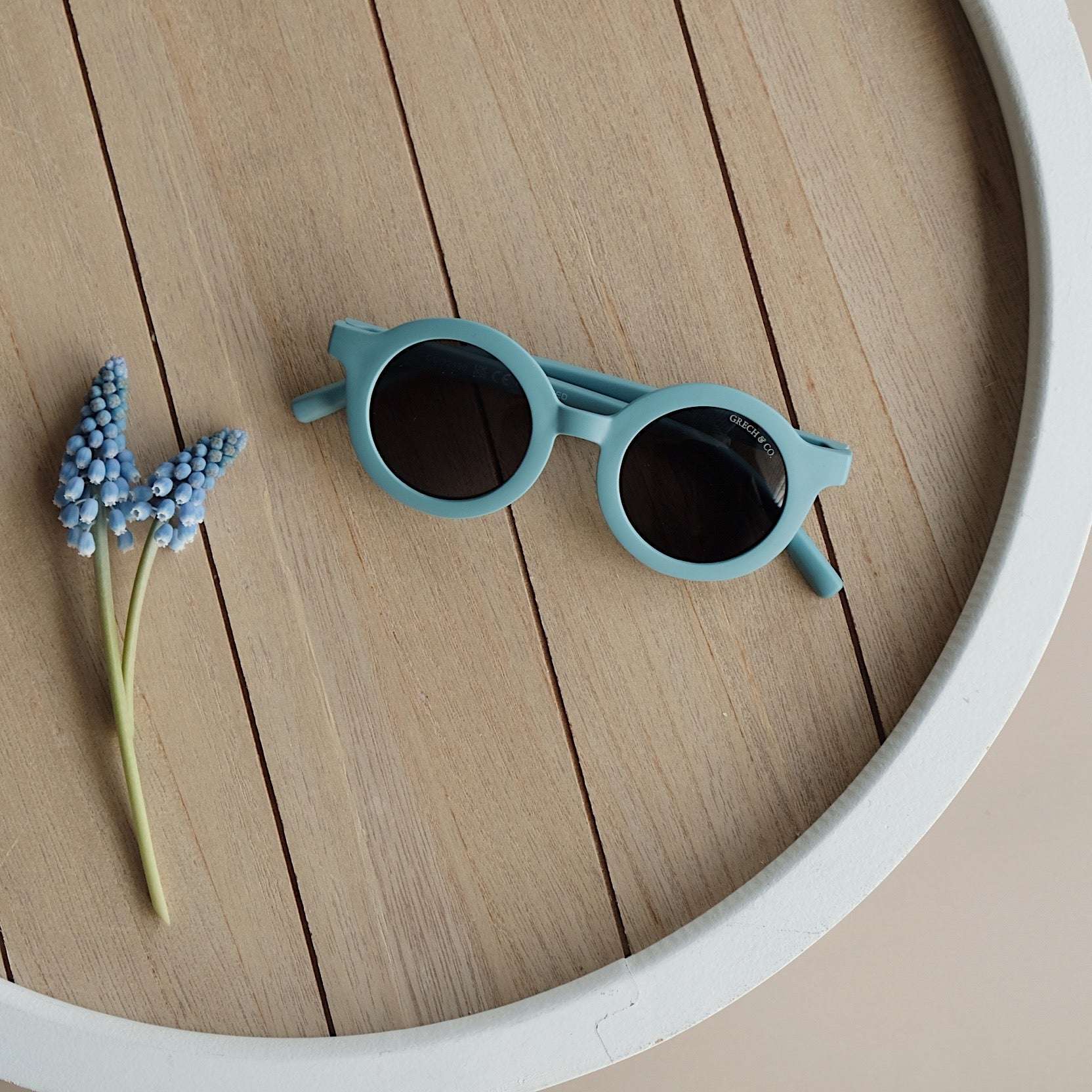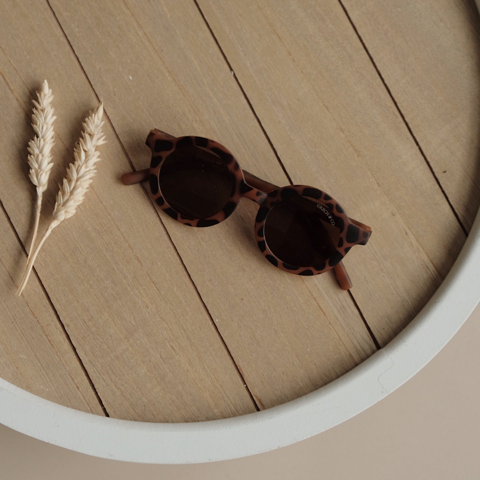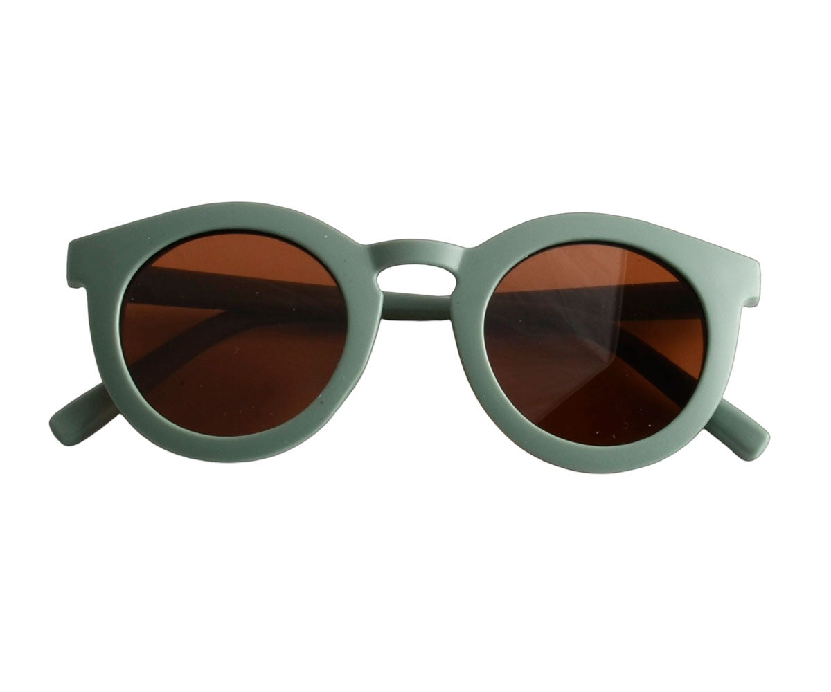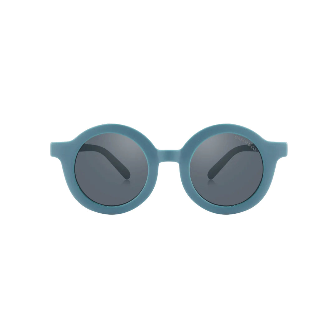 Nachhaltige und stylische Kindersonnenbrillen, hergestellt aus recyceltem Plastik in zeitlosen Farben von Grech & Co. Die Sonnenbrillen haben einen UV-Lichtschutzfaktor UV 400 zum Schutz der Augen Deines Kindes und werden in einem hübschen Beutel geliefert.
