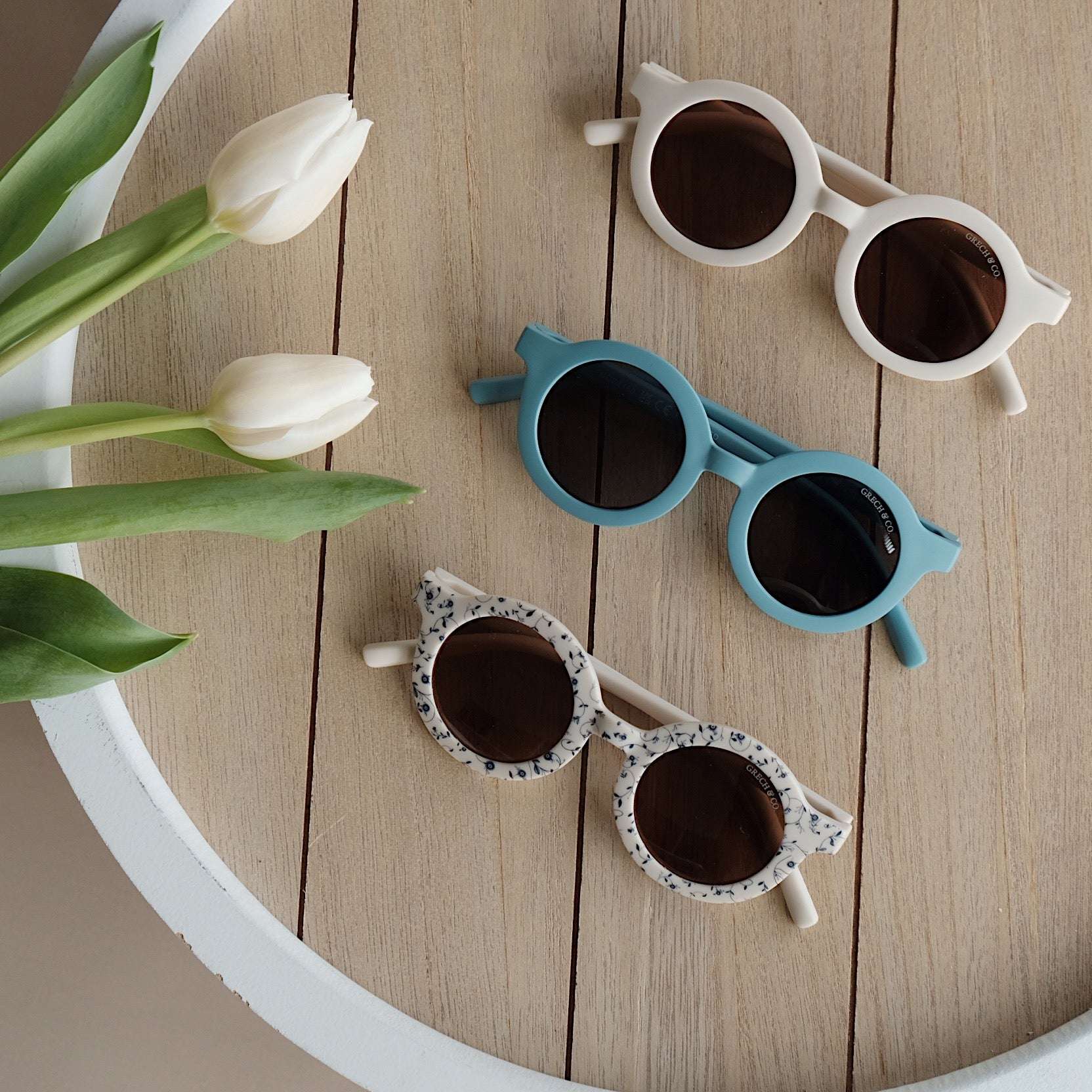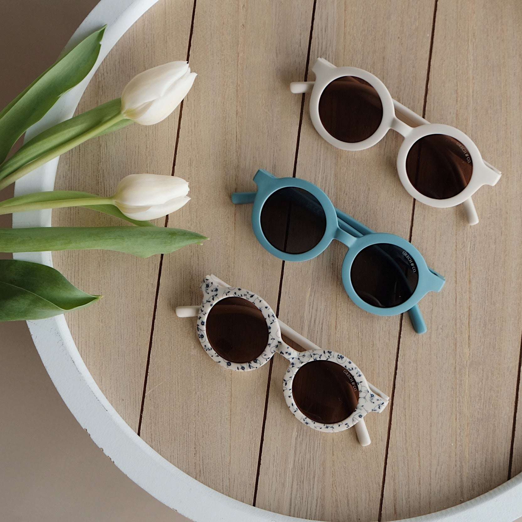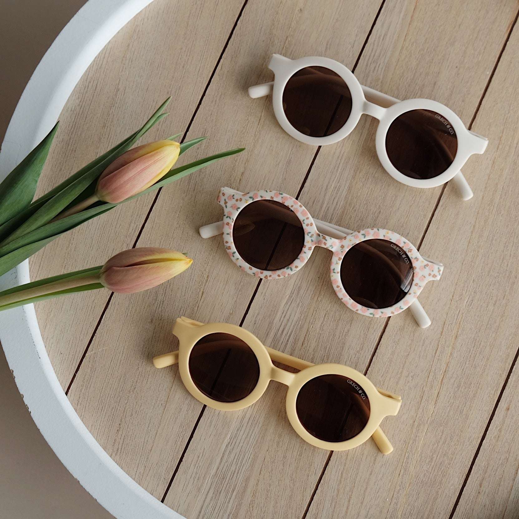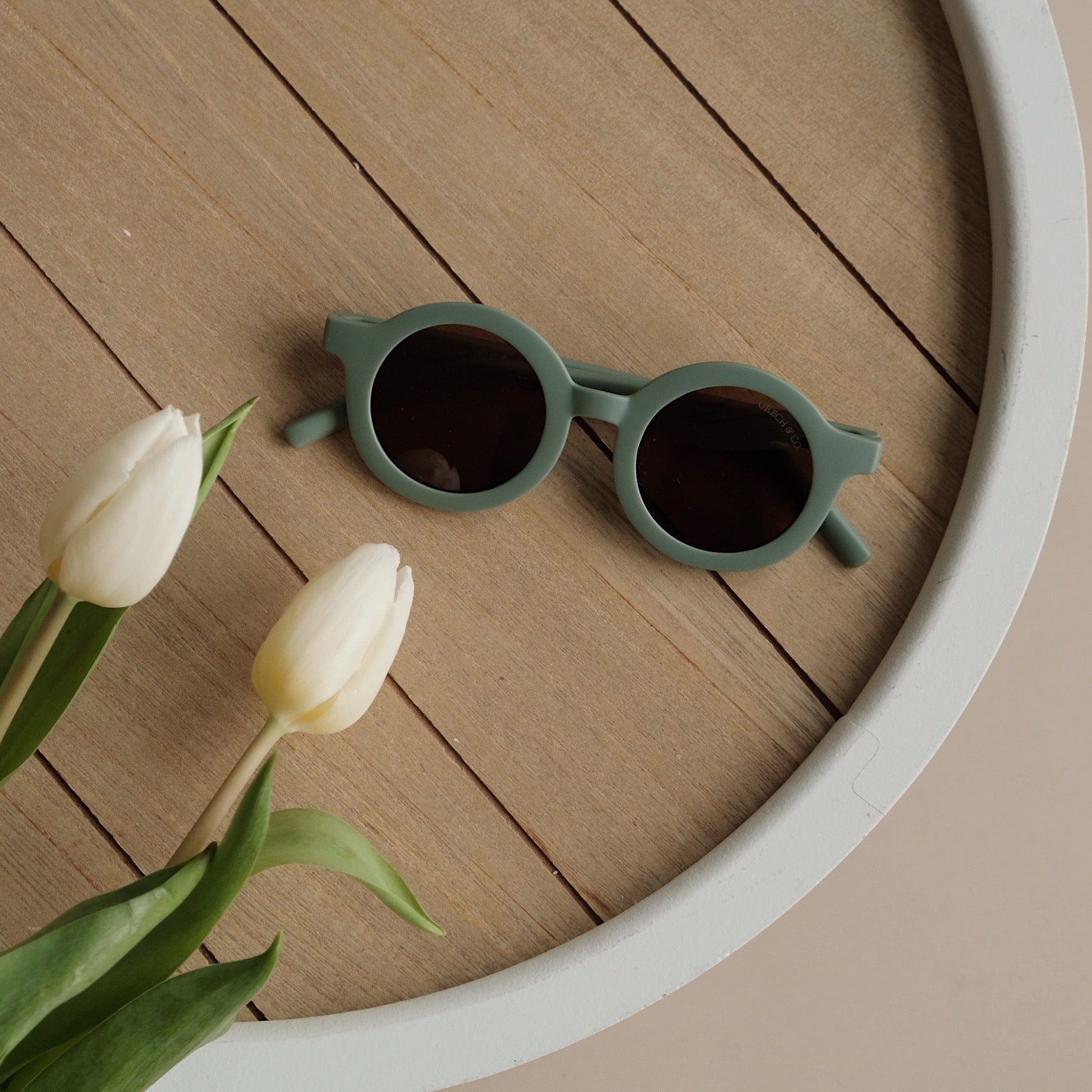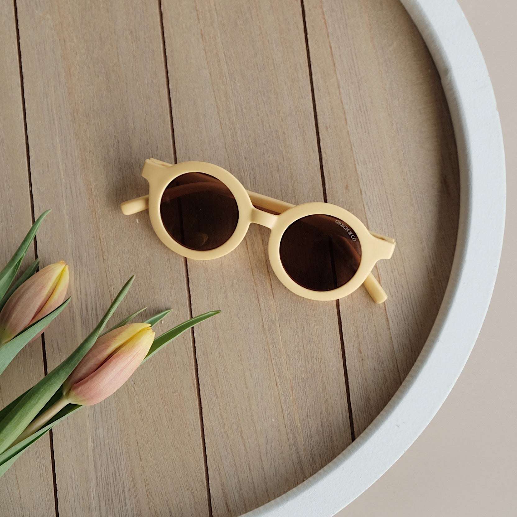 Nachhaltige und stylische Kindersonnenbrillen, hergestellt aus recyceltem Plastik in zeitlosen Farben von Grech & Co. Die Sonnenbrillen haben einen UV-Lichtschutzfaktor UV 400 zum Schutz der Augen Deines Kindes und werden in einem hübschen Beutel geliefert.