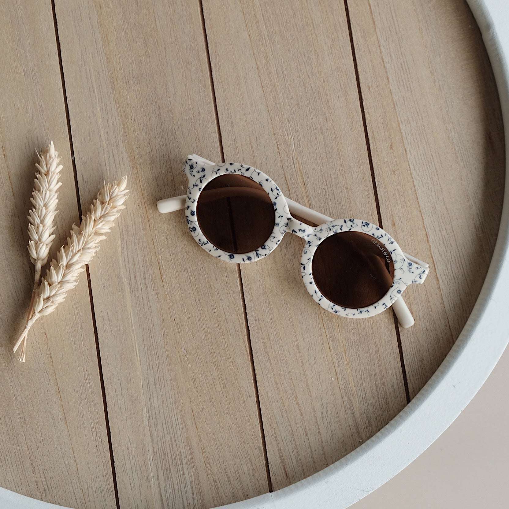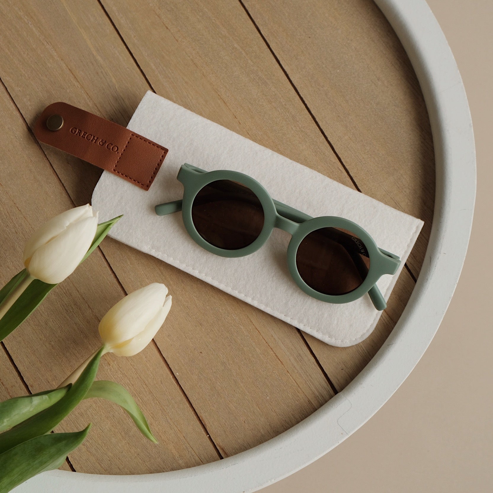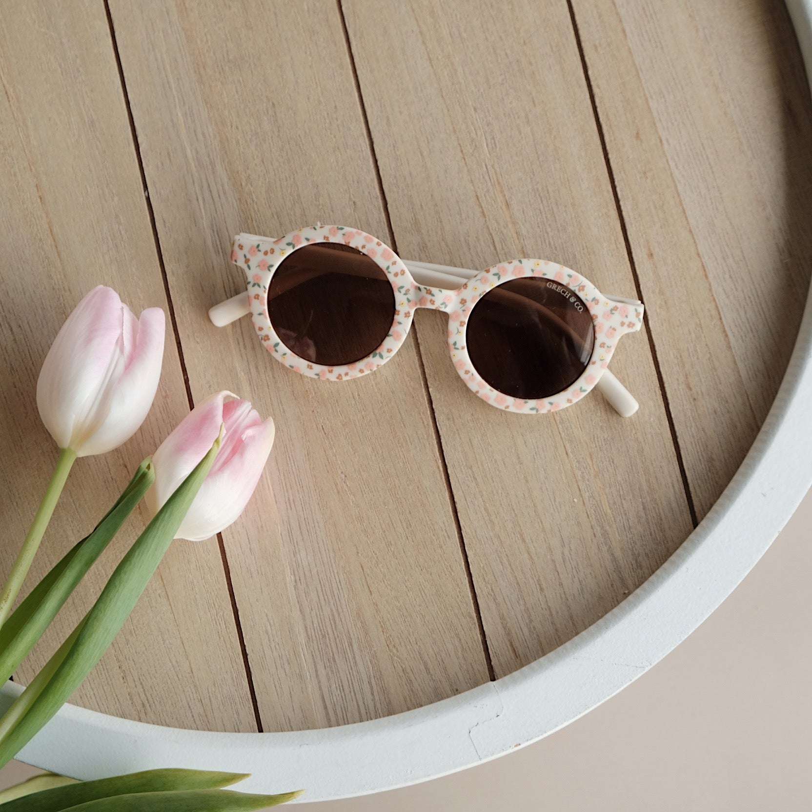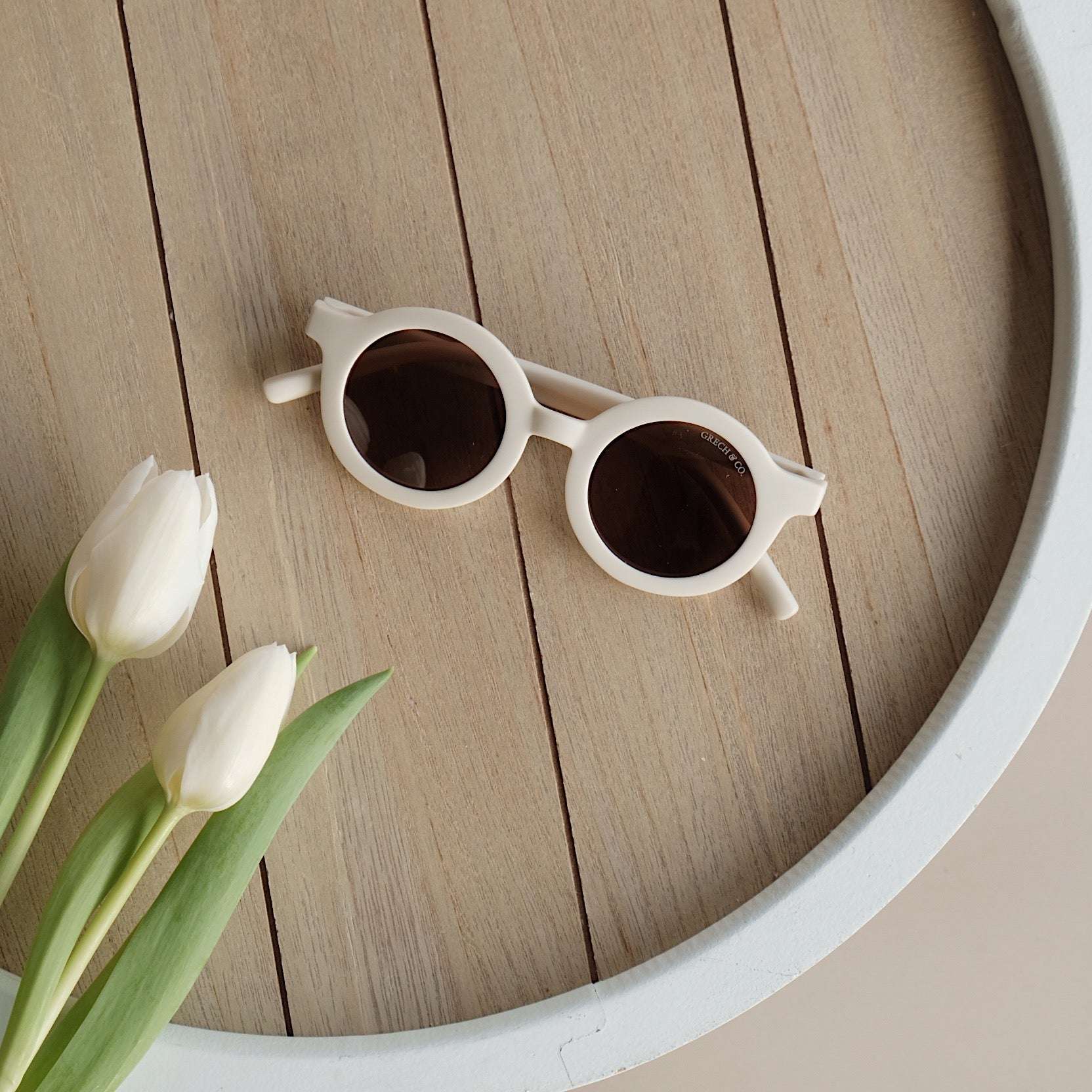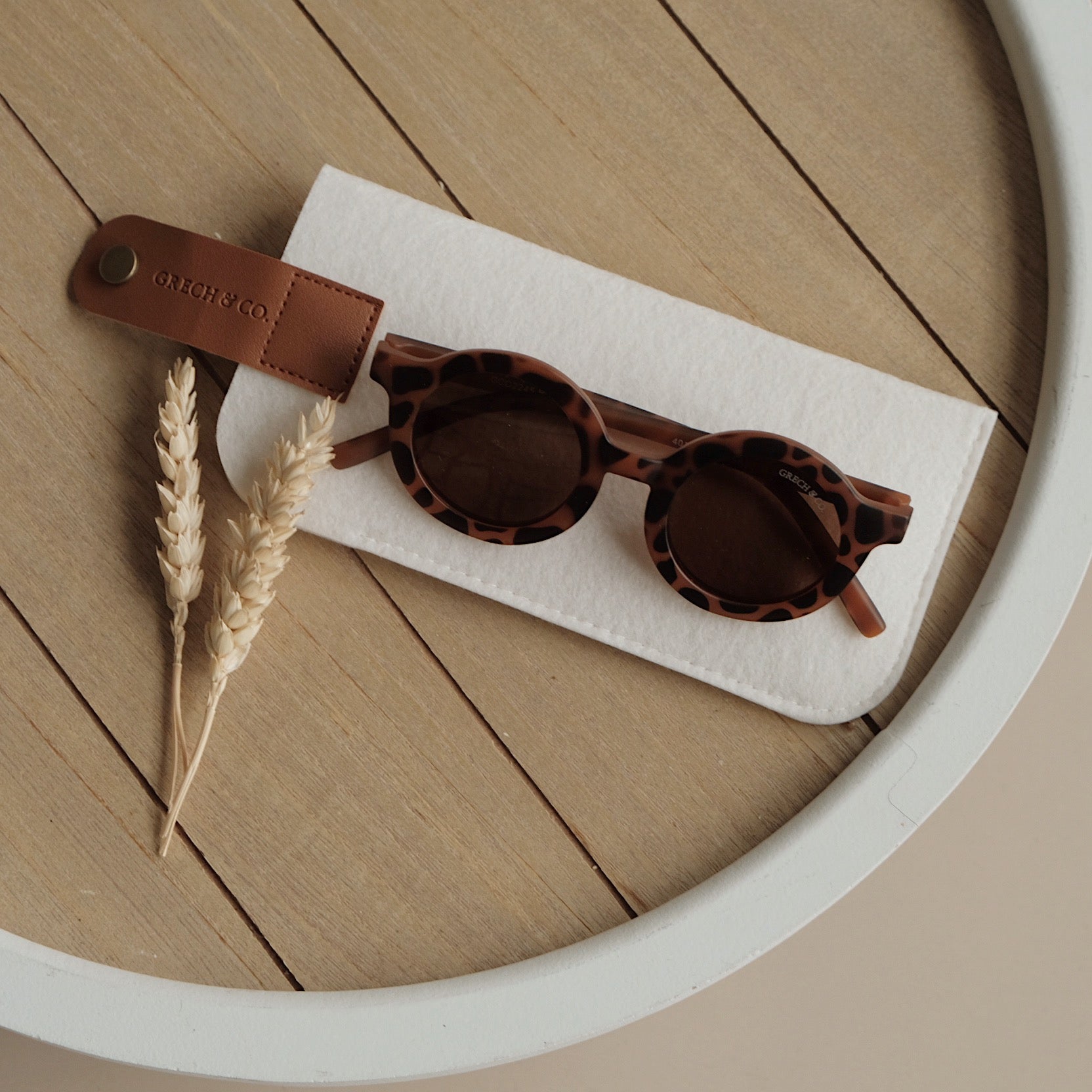 Nachhaltige und stylische Kindersonnenbrillen, hergestellt aus recyceltem Plastik in zeitlosen Farben von Grech & Co. Die Sonnenbrillen haben einen UV-Lichtschutzfaktor UV 400 zum Schutz der Augen Deines Kindes und werden in einem hübschen Beutel geliefert.