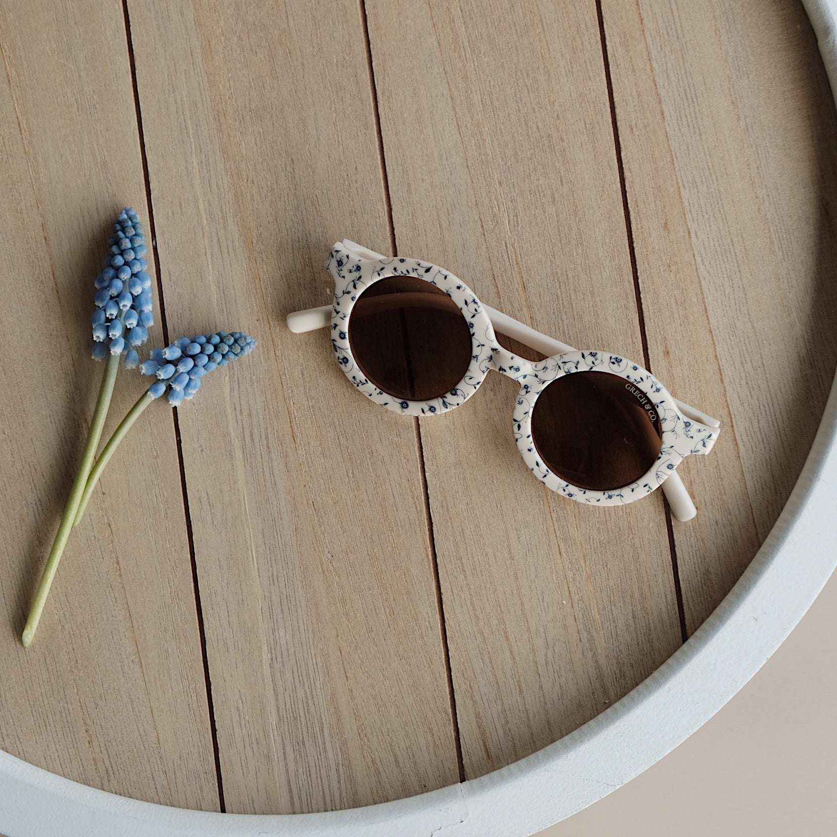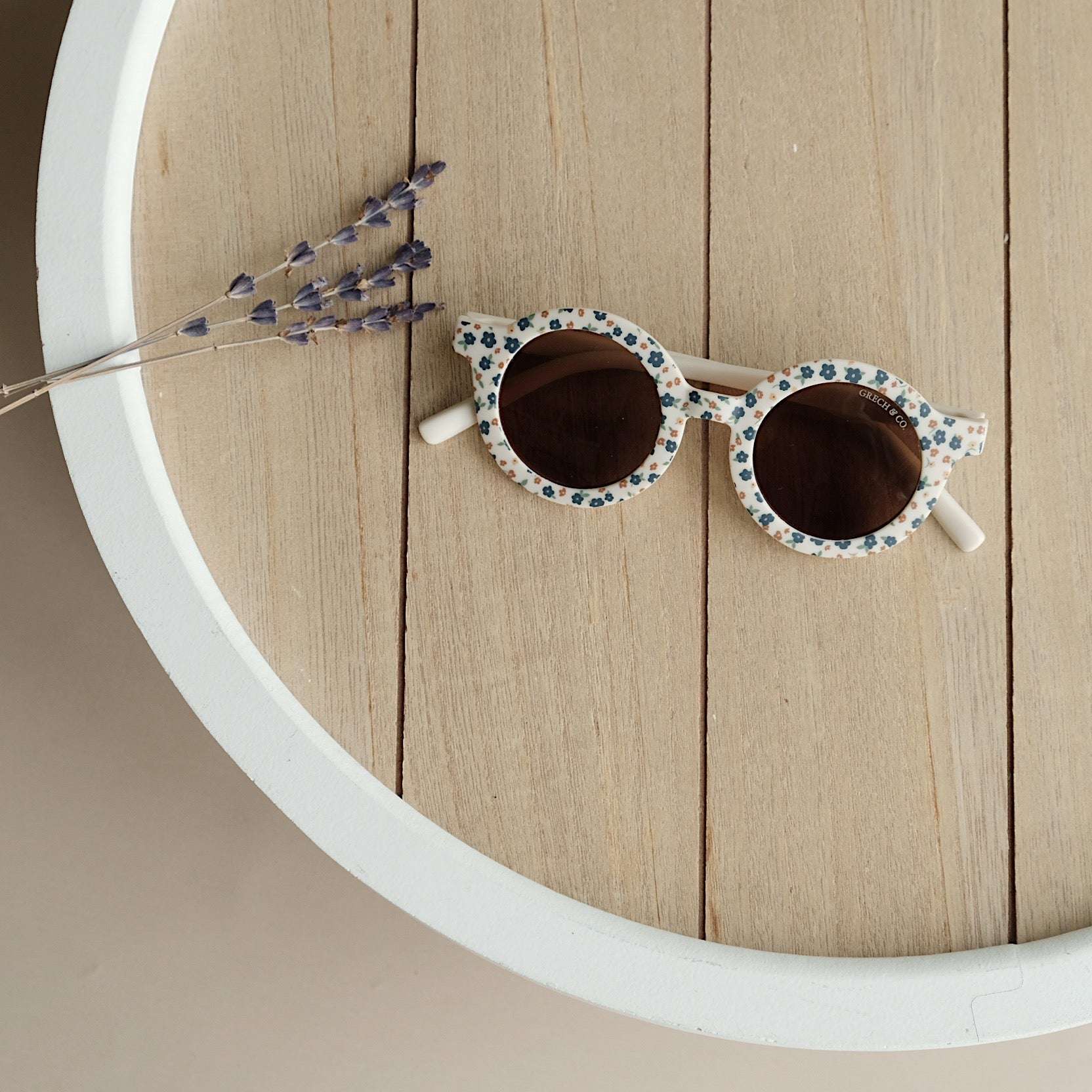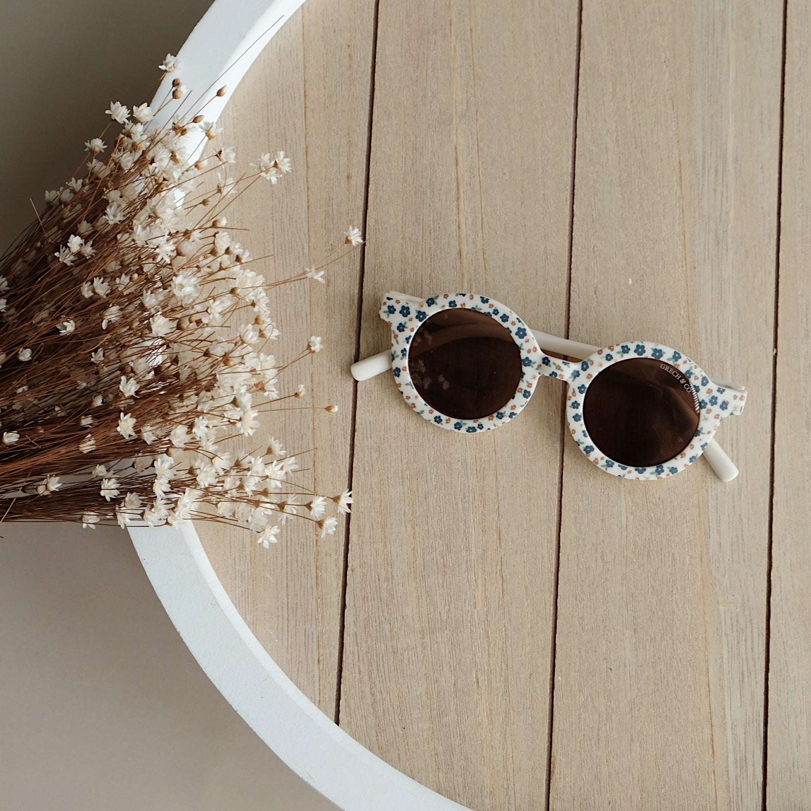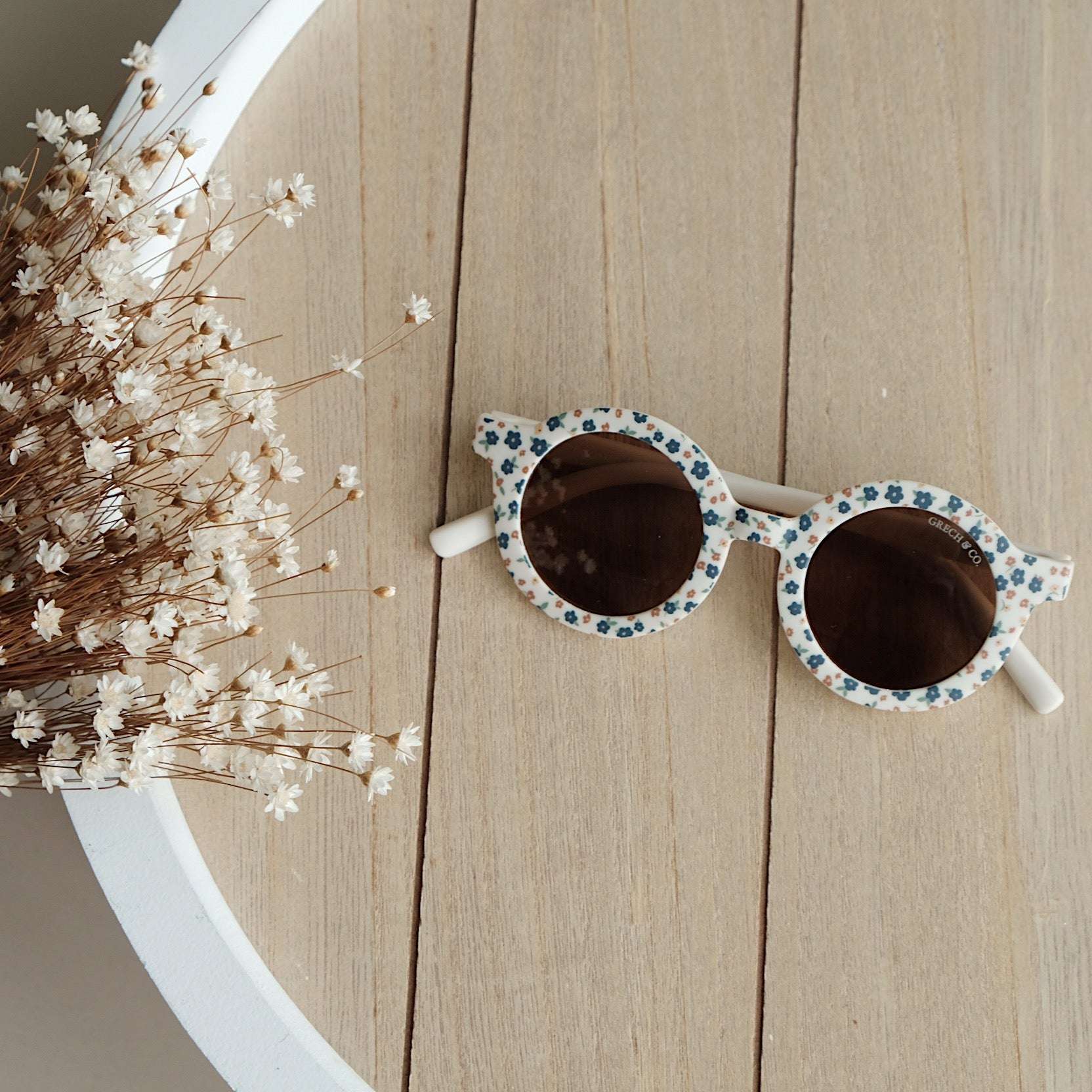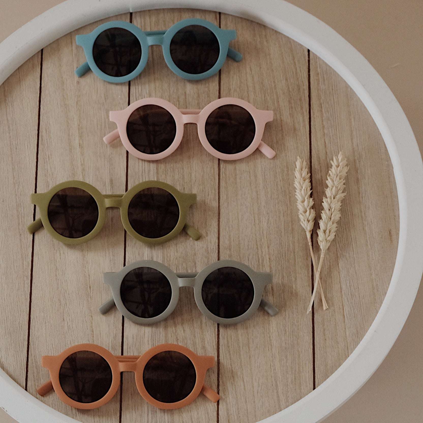 Nachhaltige und stylische Kindersonnenbrillen, hergestellt aus recyceltem Plastik in zeitlosen Farben von Grech & Co. Die Sonnenbrillen haben einen UV-Lichtschutzfaktor UV 400 zum Schutz der Augen Deines Kindes und werden in einem hübschen Beutel geliefert.