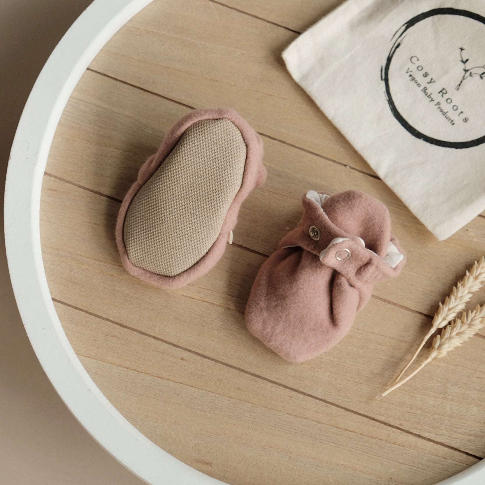Cuddly soft booties made from GOTS-certified organic cotton with a practical snap fastener to individually adjust the width of the shoe.